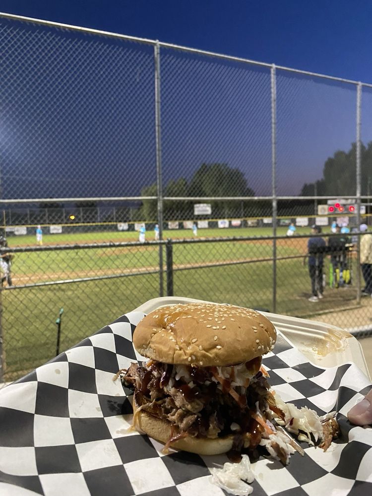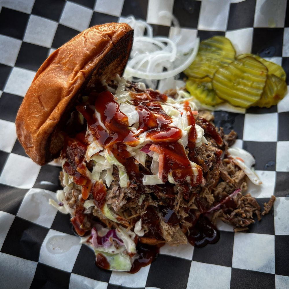 Sandwich with BBQ Sauce Pickles and pickled onions